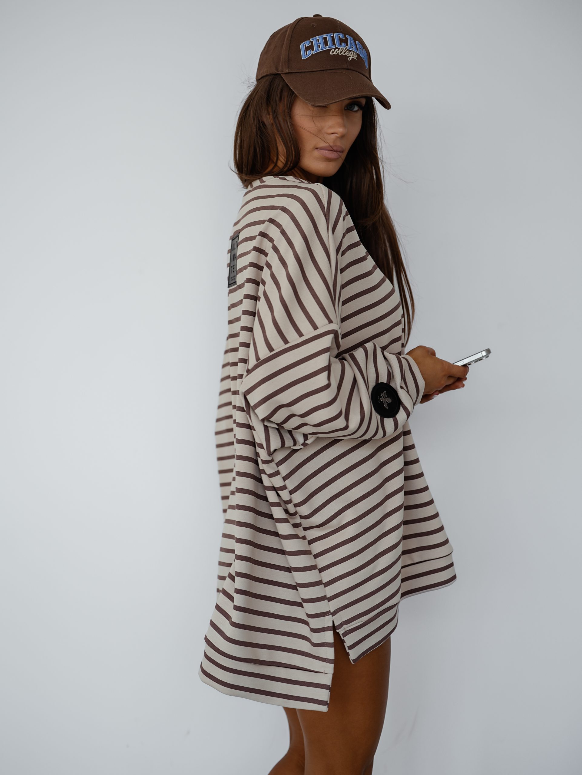 BLUZA duża oversize mucha me gusta paski beż-czekolada
