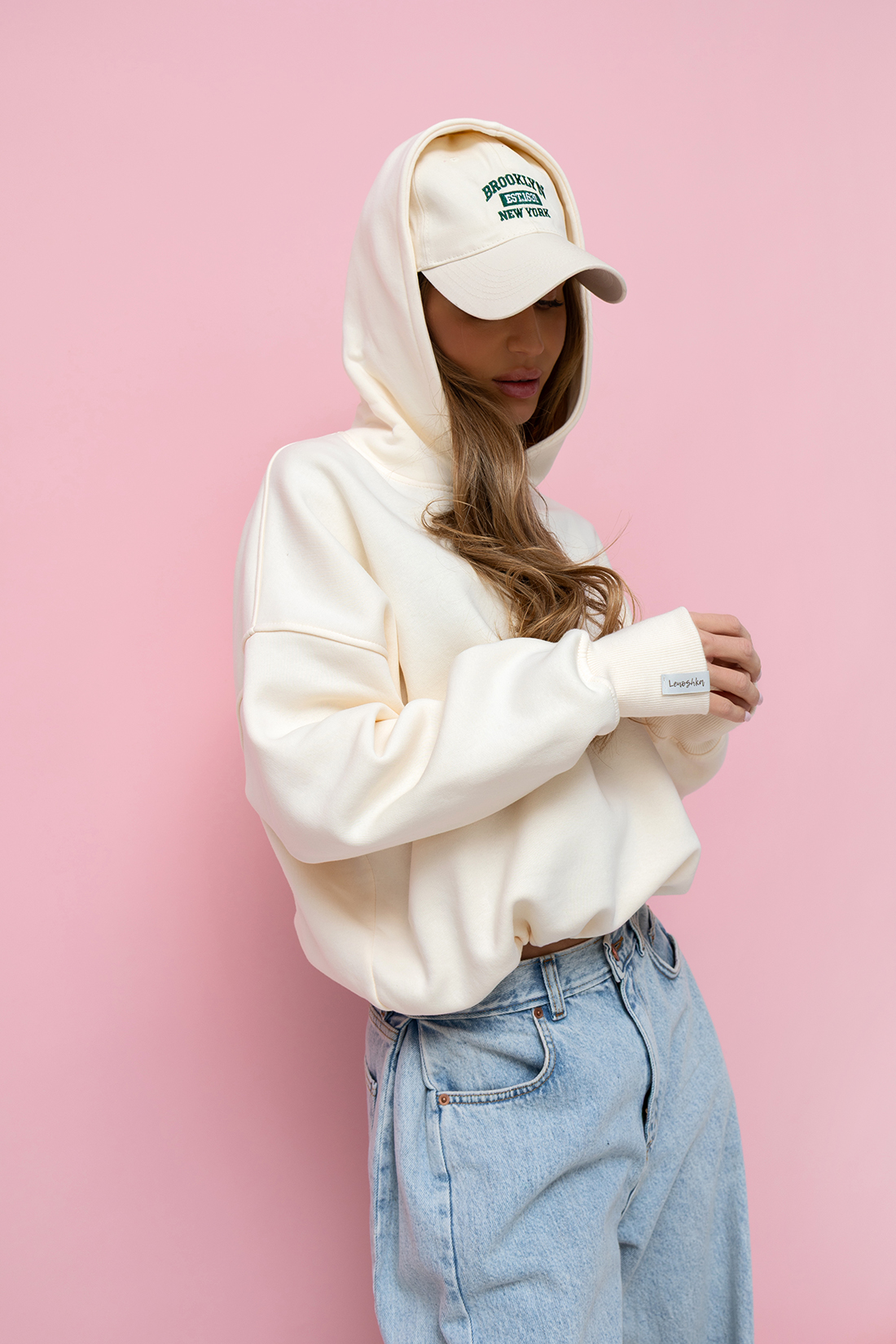 Modna bluza hoodie w kolorze kokosowym, która łączy wygodę z wyrazistym, trendowym stylem. To model idealny dla kobiet, które lubią casualowe fasony z charakterem.