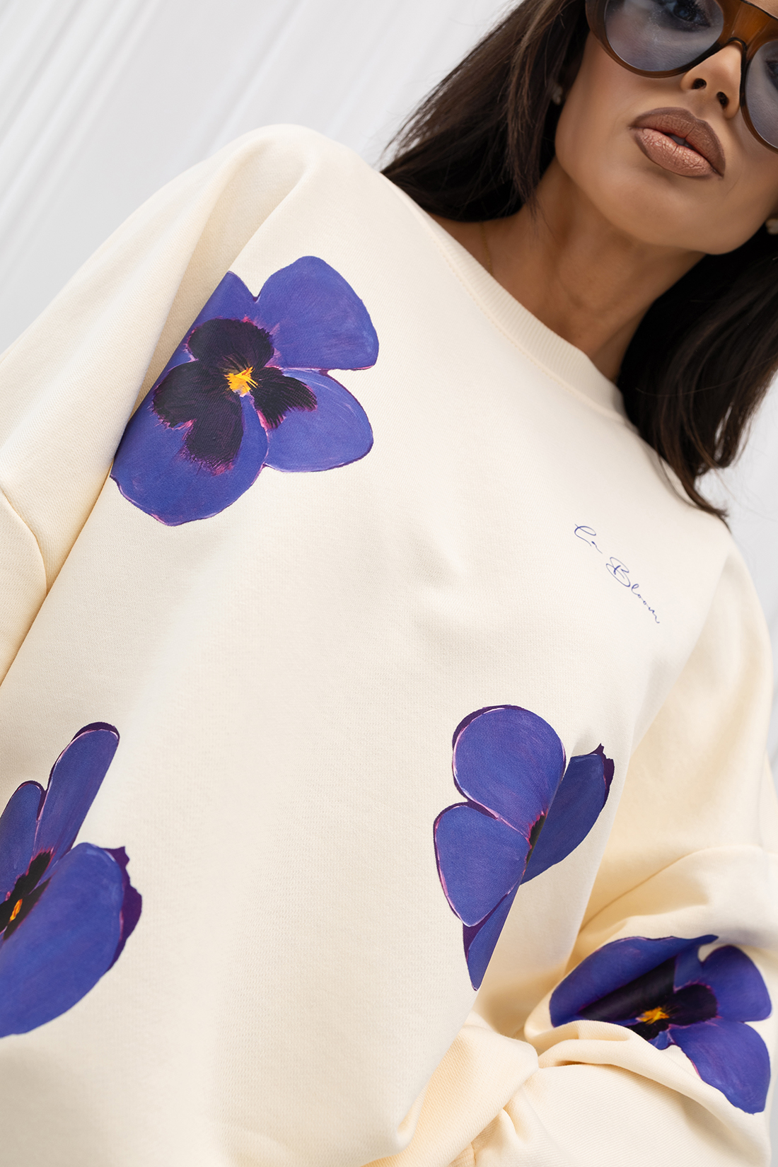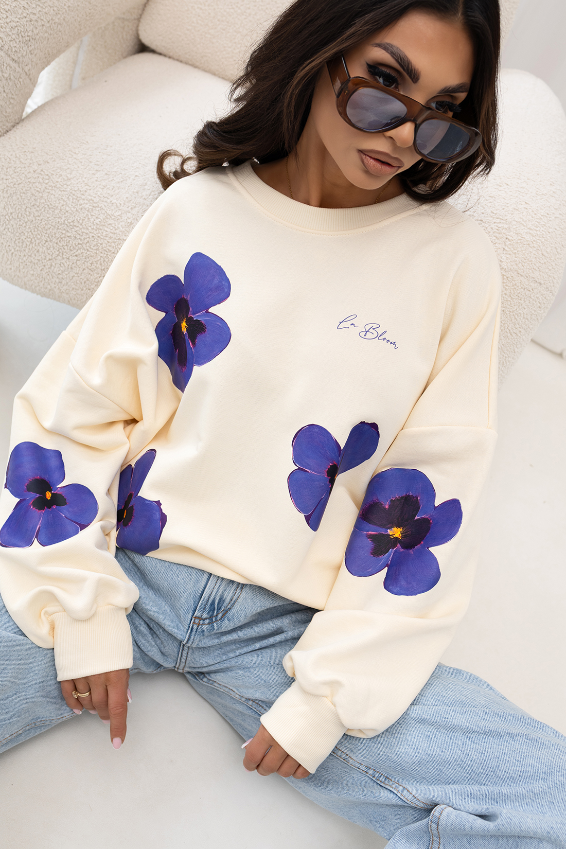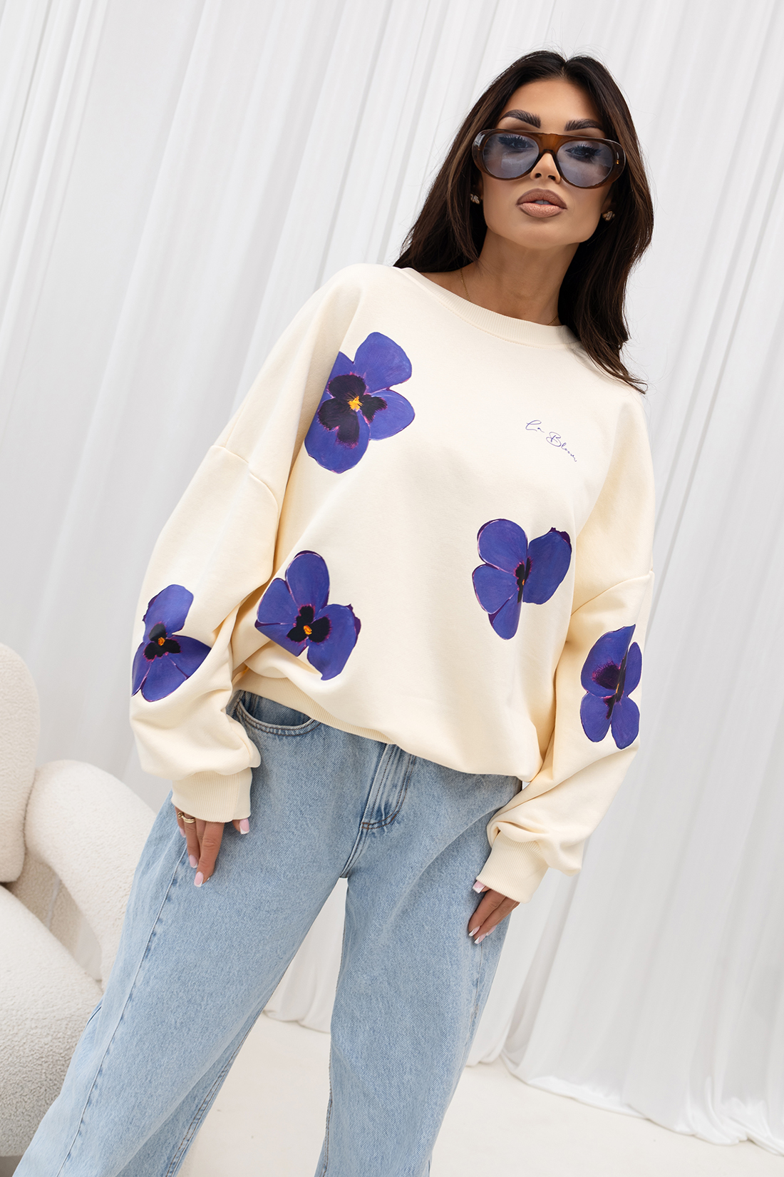 Elegancka i ponadczasowa bluza w odcieniu kremowej bieli, ozdobiona wyrazistym kwiatowym printem w głębokich tonach fioletu. Stonowana kolorystyka w połączeniu z mocnym akcentem tworzy harmonijną i stylową całość.